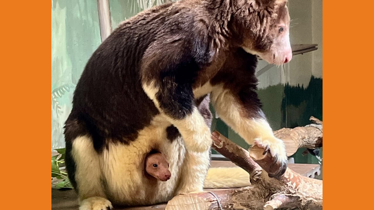 The Gist: A Matschie’s tree kangaroo joey has been spotted peeking out from its mother Judie’s pouch at the Lincoln Children’s Zoo. Born in April, the little one is now about 26 weeks old and just beginning to explore the world beyond its cozy home with dad Bexley nearby.